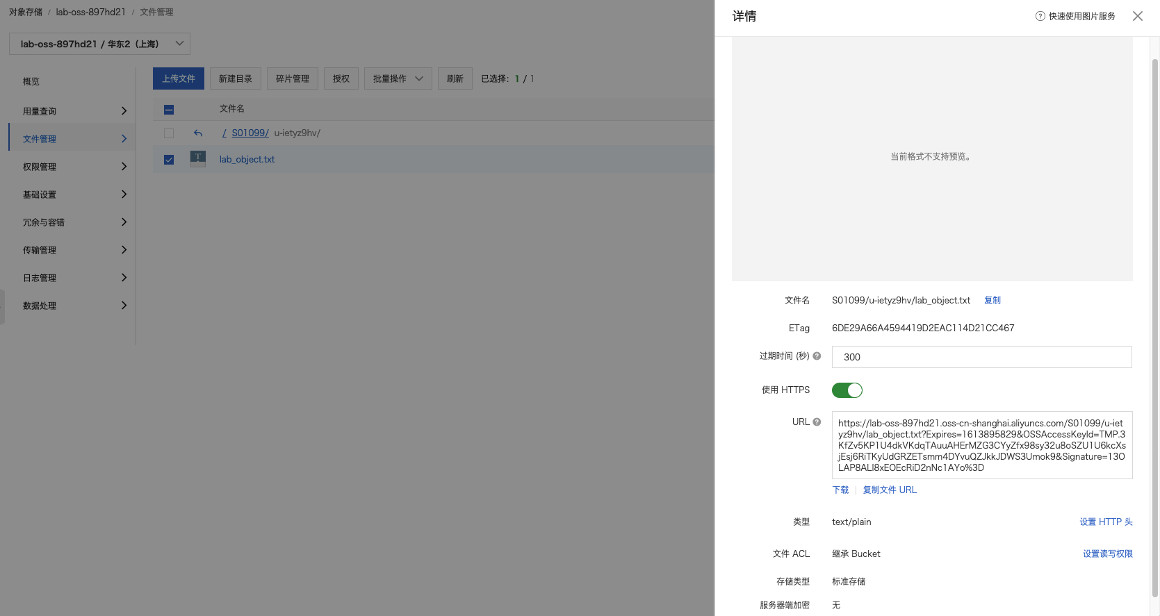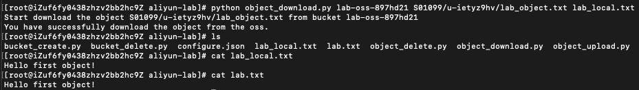 将 OSS 存储的文件 lab_object.txt 下载到本地,并重命名为 lab_local.txt 。下载成功后,执行命令 ls ,列出当前目录下所有的文件,可以看到文件lab_local.txt 已经保存在当前目录下。