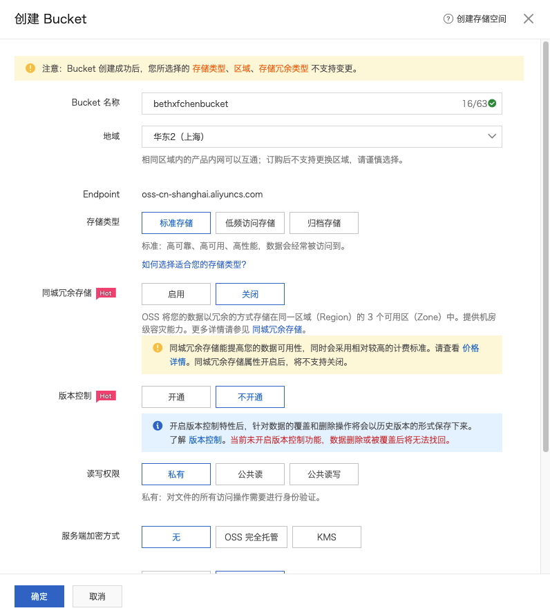 - Region,表示OSS的数据中心所在的区域,物理位置。 一旦指定之后就不允许更改,该Bucket下所有的Object都存储在对应的数据中心。
