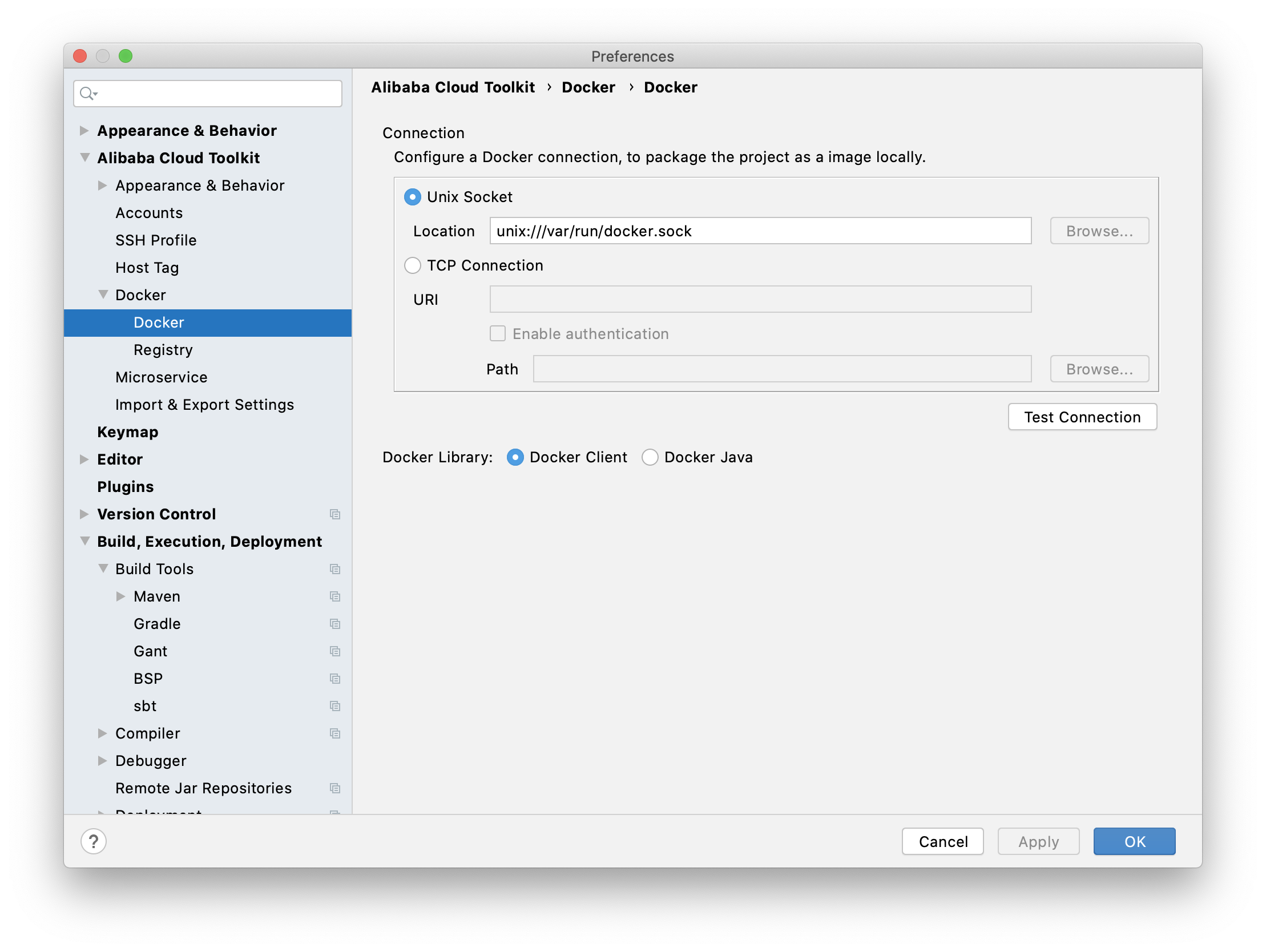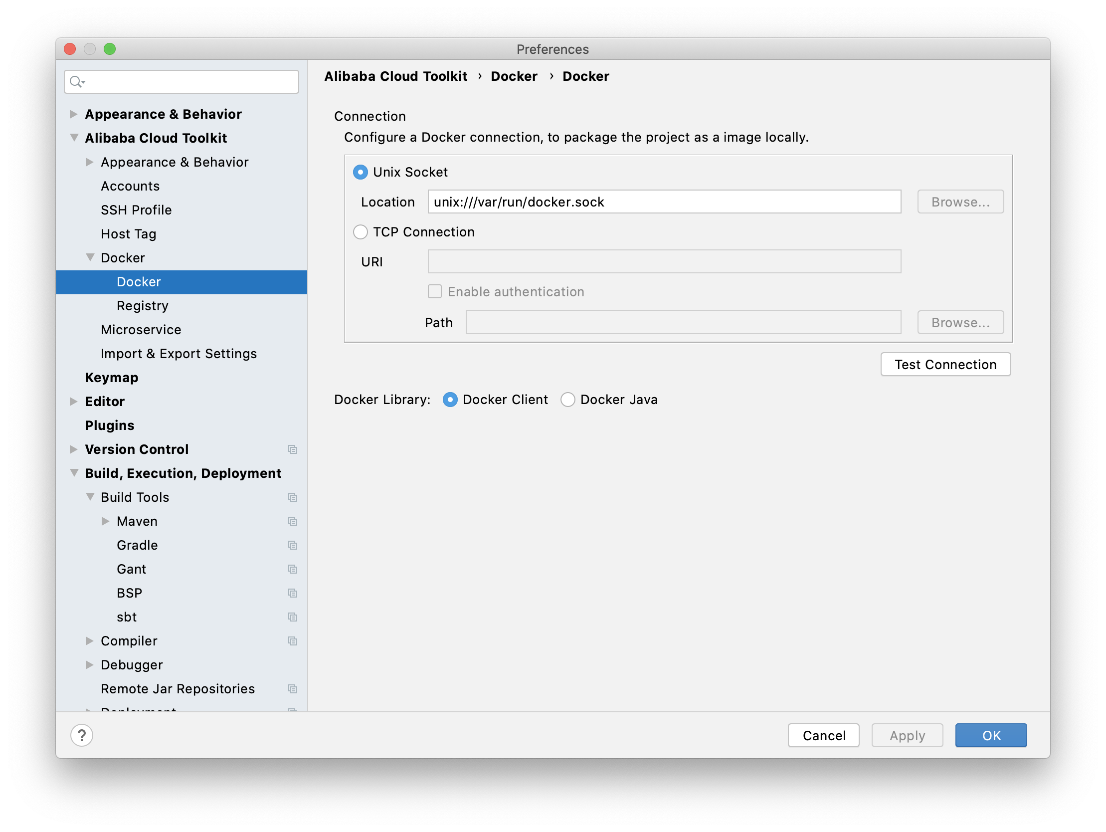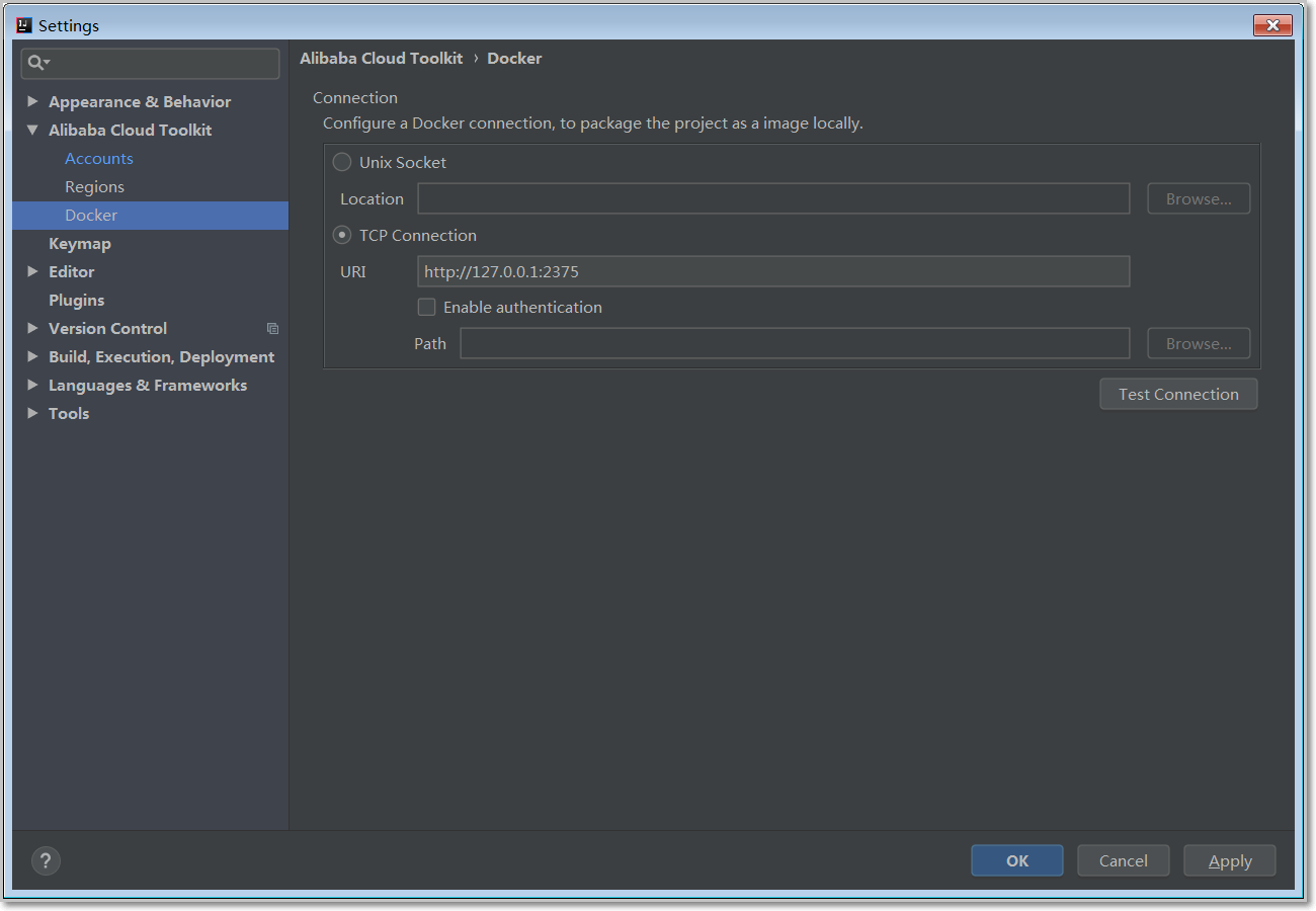 - 在 Docker 界面中设置 Cloud Toolkit 需要连接的 Docker 环境。