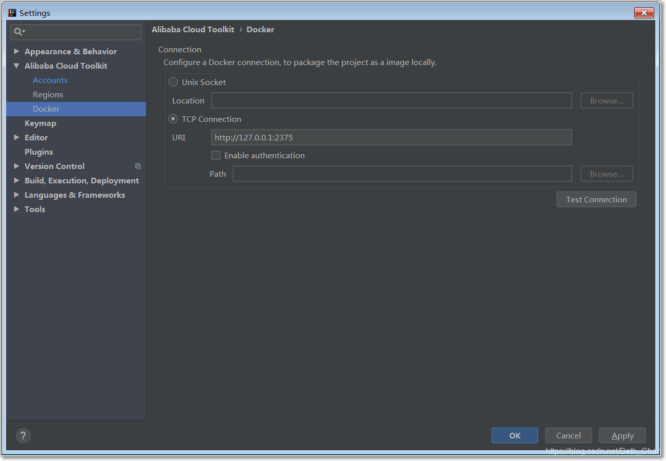 - 本地为 Windows 操作系统,勾选 TCP Connection,然后在 URI 右侧文档框输入本地 Docker 的 URI,如 http://127.0.0.1:2375。