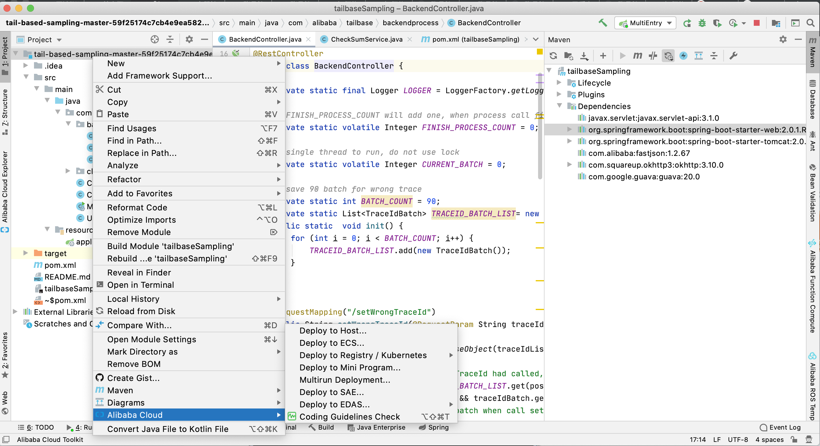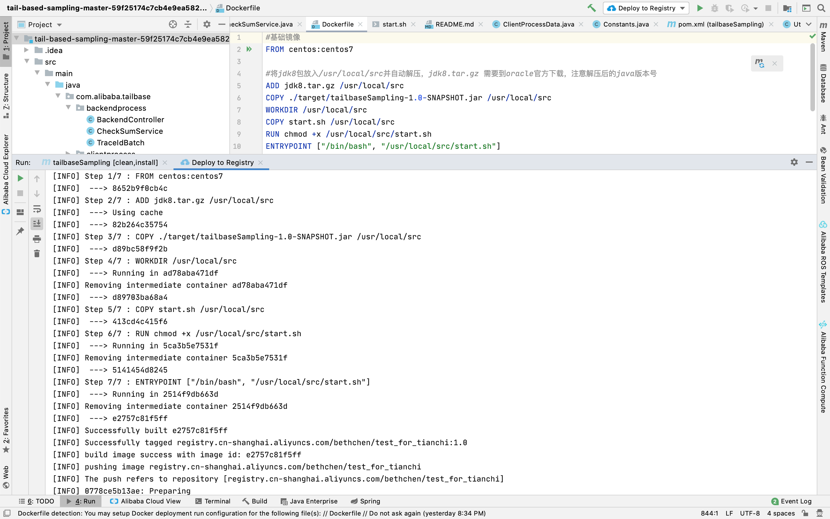 - 在 IntelliJ IDEA 界面左侧的 Project 中右键单击您的 Docker 应用工程名,在弹出的下拉菜单中选择 Alibaba Cloud > Deploy to Registry