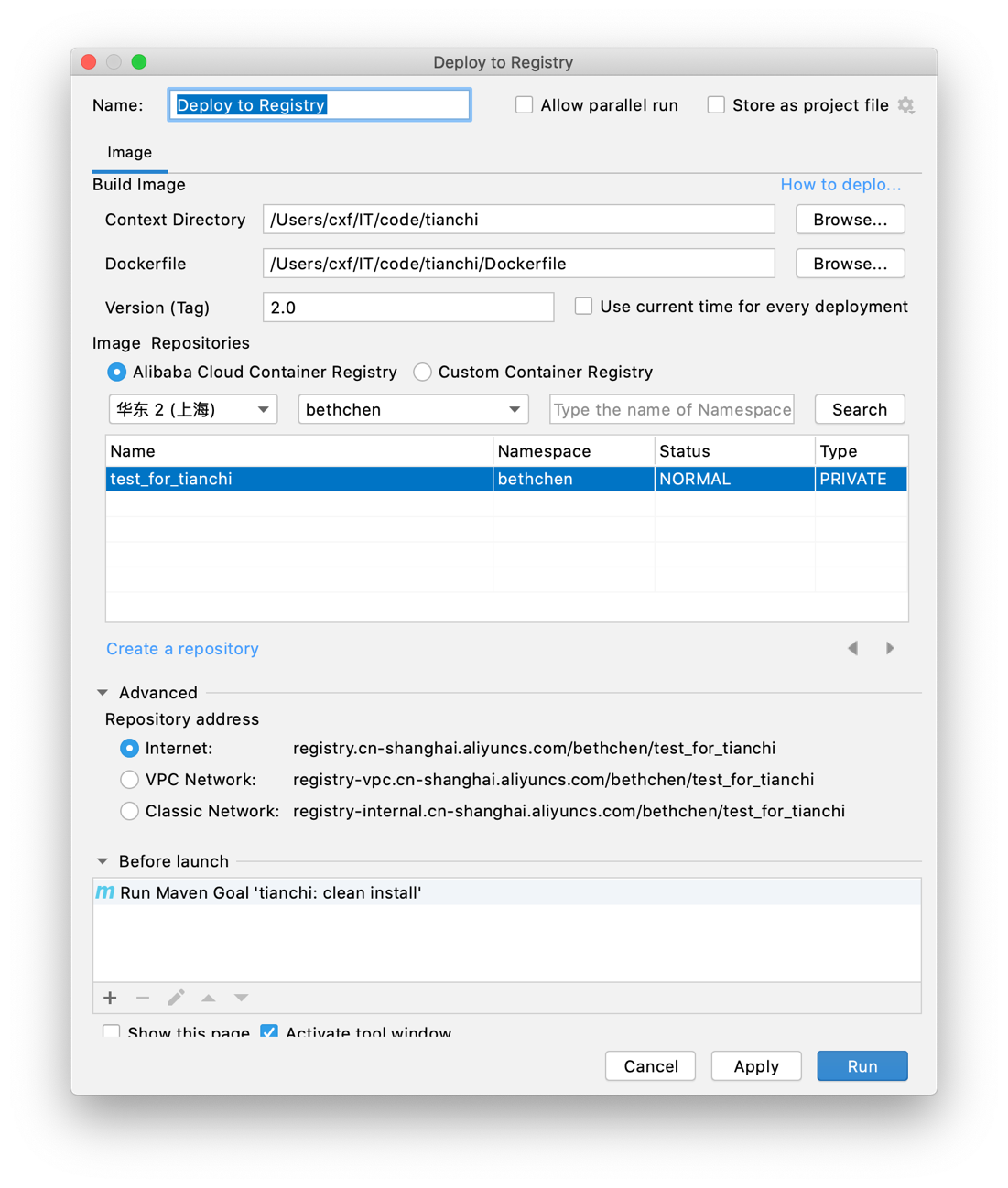 - 在 Deploy to Registry对话框中进行以下配置。