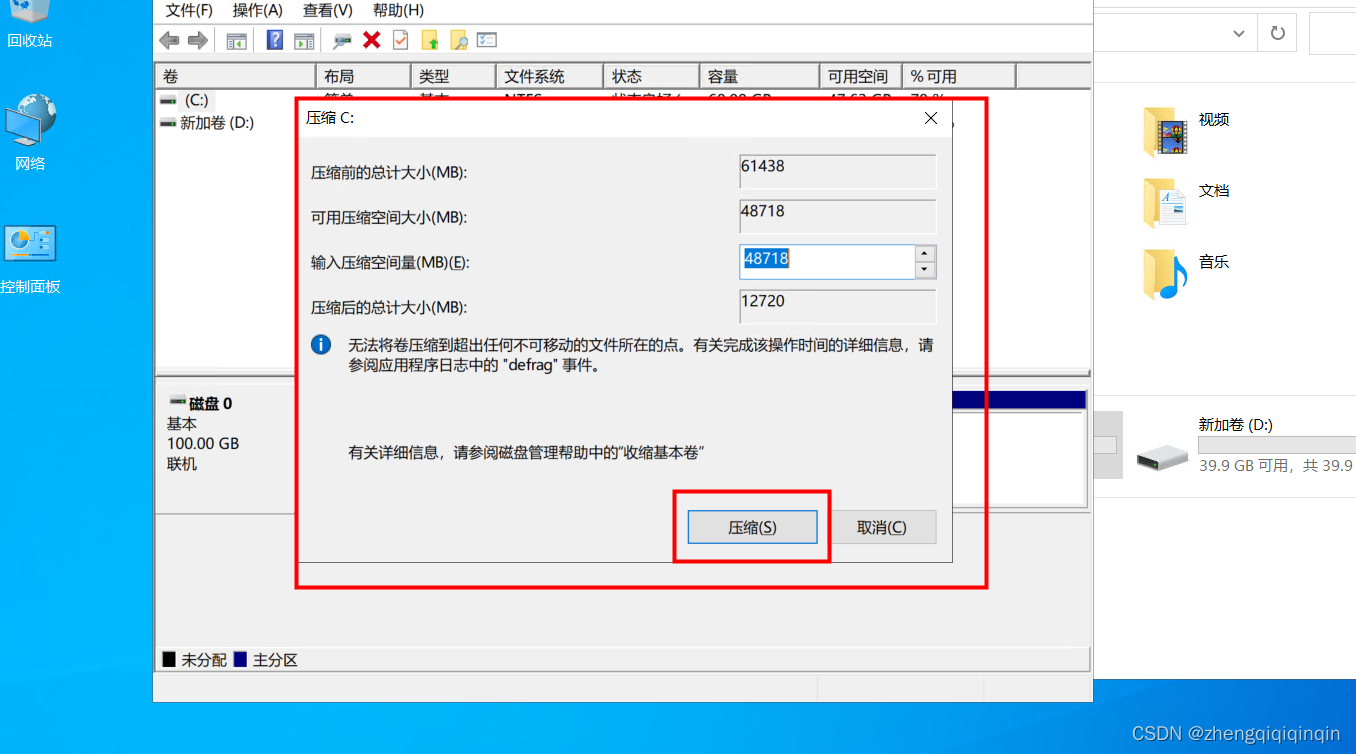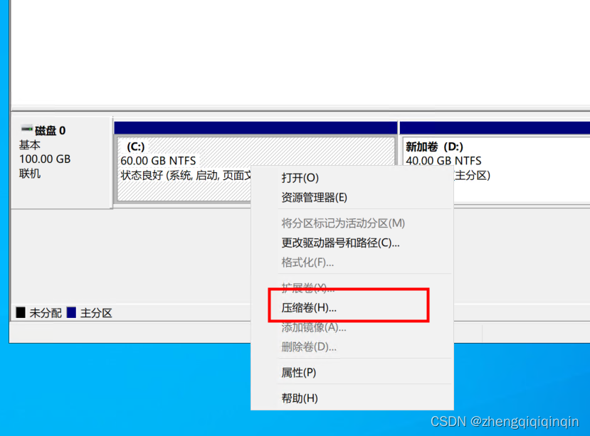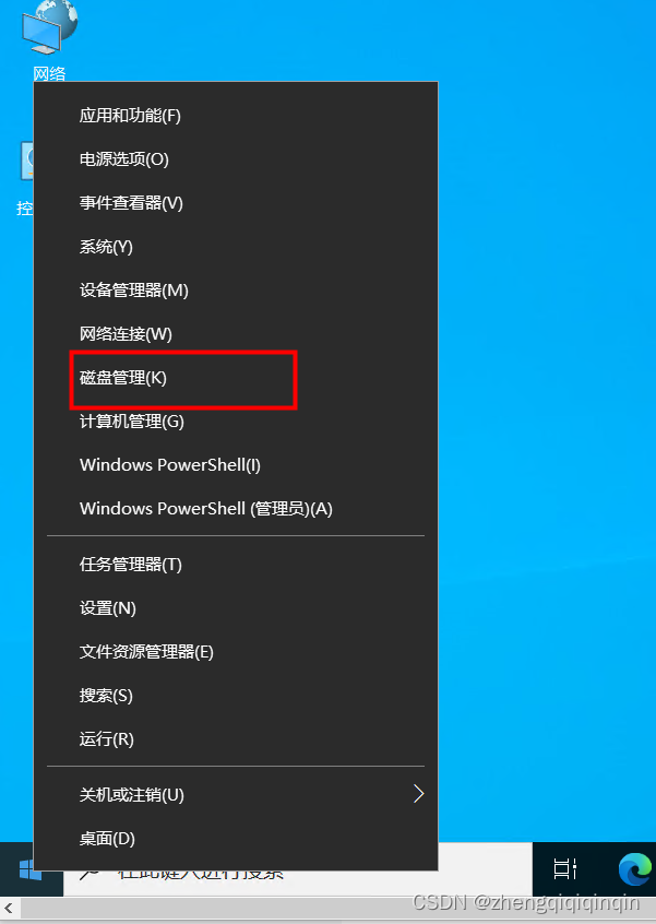 2. 在左下角的徽标键 右键,选择【磁盘管理】,然后在原有只有C盘的磁盘下,右键,点击压缩卷,输入对应的压缩空间,然后给新压缩的分配磁盘号(比如D盘)即可