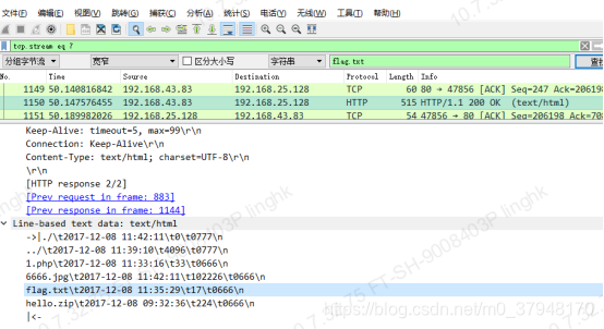 - 解析:pcapng是一个抓包文件,使用Wireshark打开,查找选择字符串,分组字节流进行查找flag.txt,找到后发现是处于一个压缩包中,