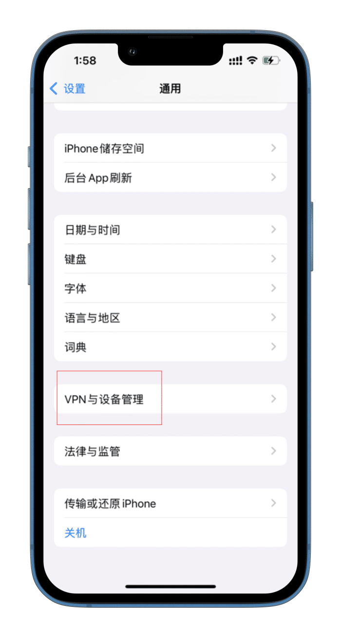 3.打开手机的“设置”,选择“通用”,接着再选择“设备管理”;