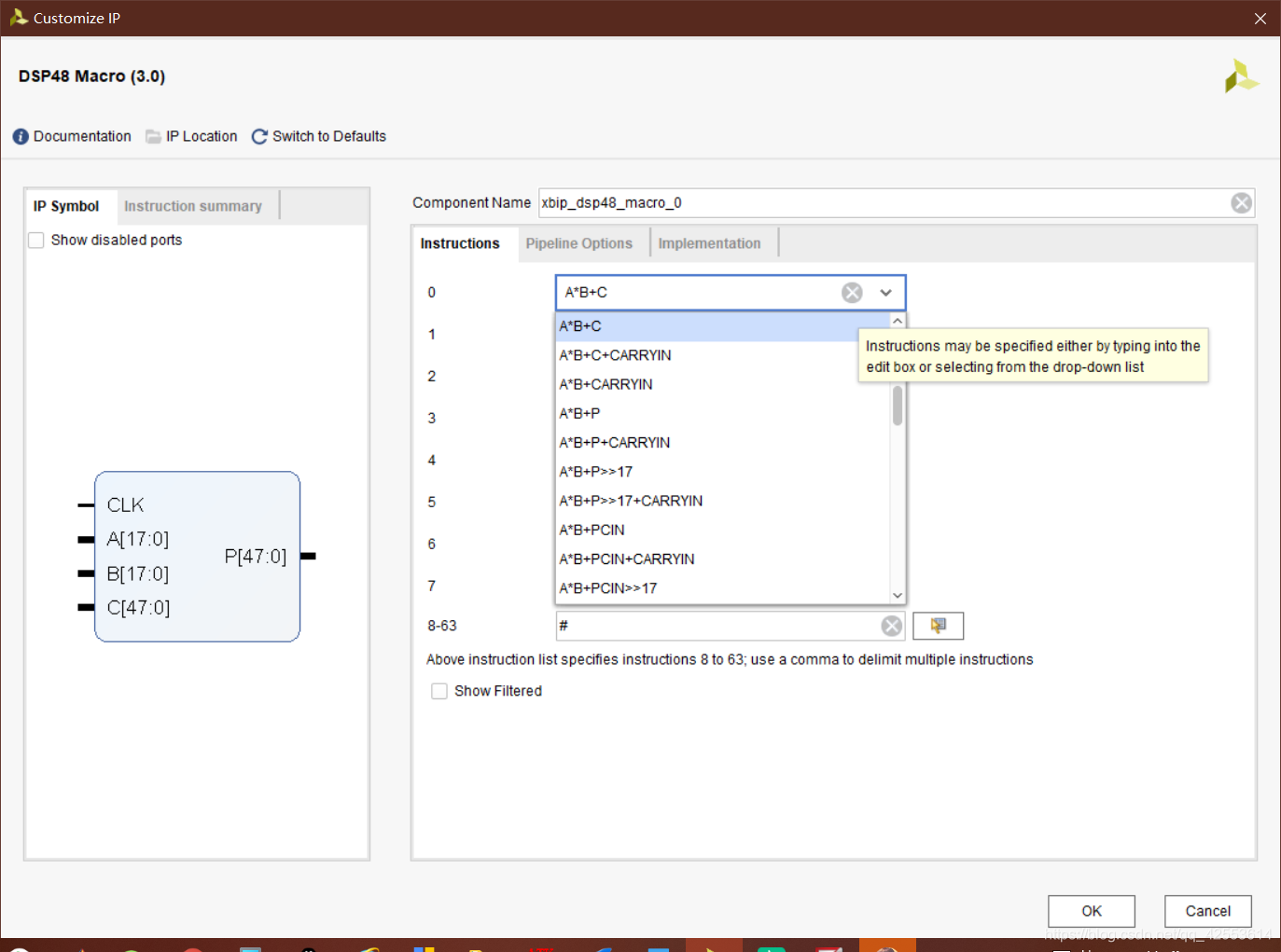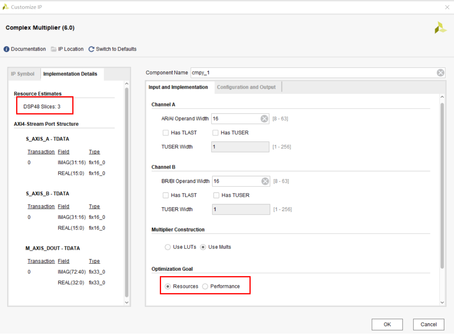 选resources时 ,用到的DSP48 Slices是3个,输出延时为6个CLK。选performance时,用到的DSP48 Slices是4个,输出延时为4个CLK。
