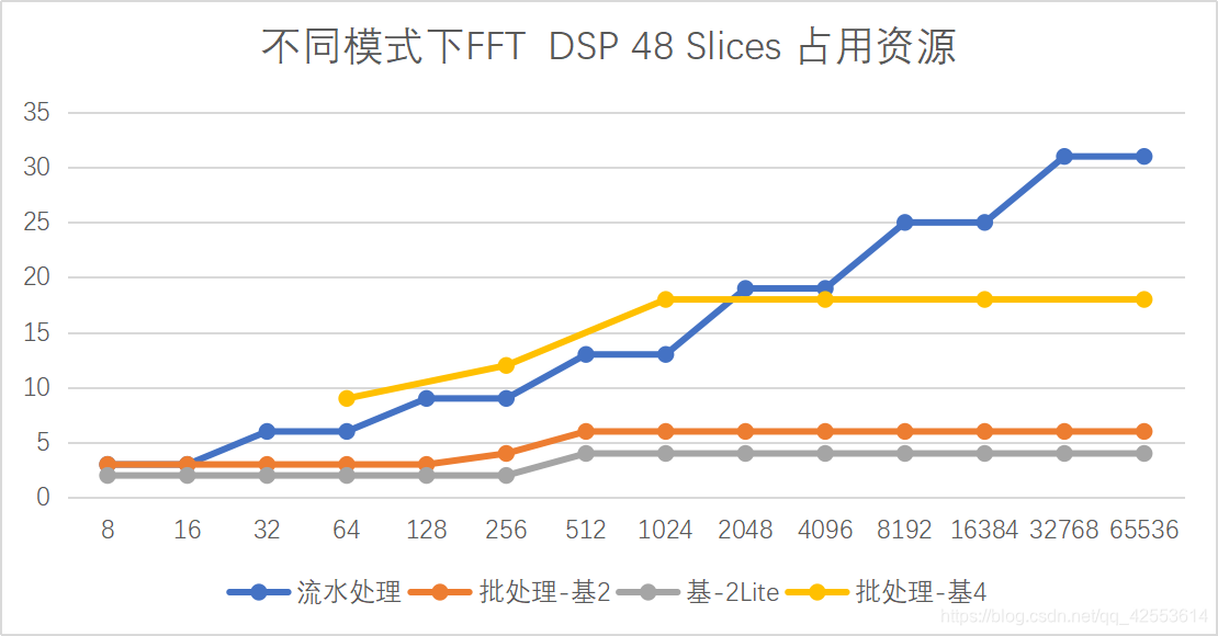 - 1024点之后,随着点数增加,基2基4所用DSP48不再增加,流水处理所用DSP48随点数增加而增加。