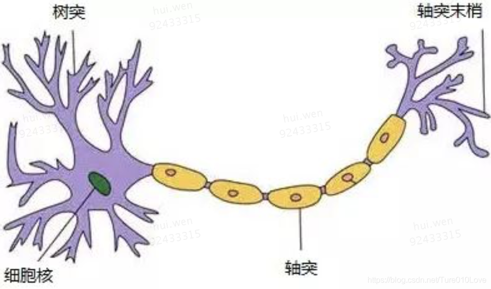 以下是神经元的结构:有很多树突、感知信息,细胞核是控制中心。通过轴突、传输至轴突末梢,给其它神经元。输入与输出都是多端的。