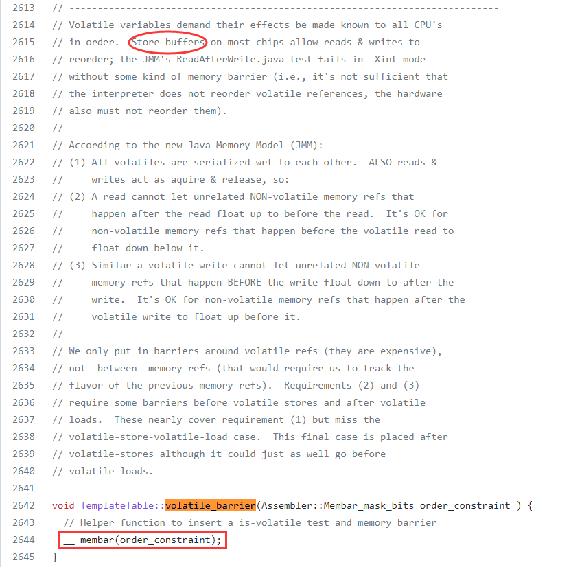 hotspot字节码解释器在处理putfield/putstatic的时候,如果要处理的结果是volatile修饰的,那么在处理完成之后还需要调用内存屏障指令OrderAccess::storeload();