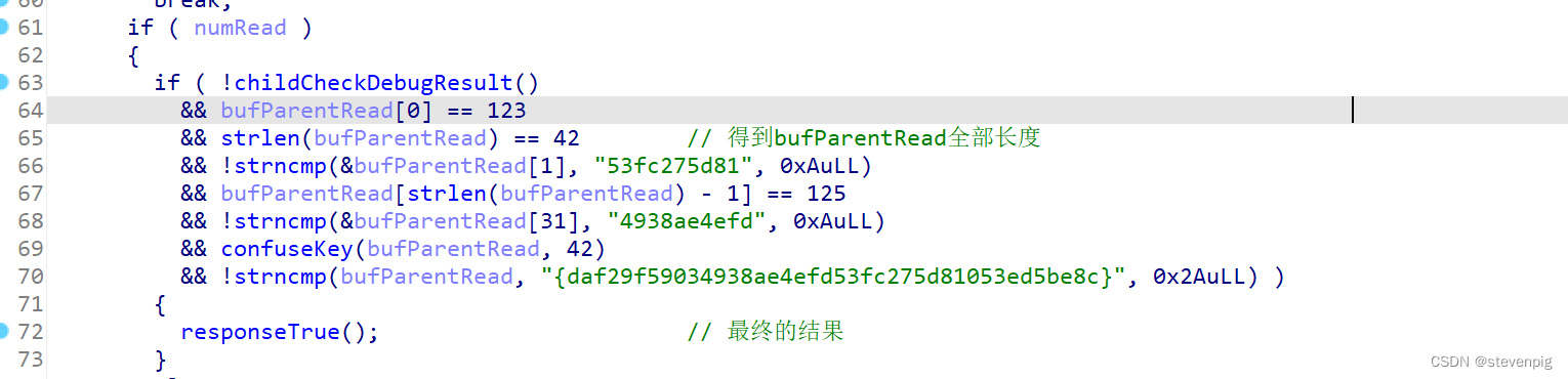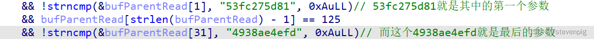 (1)、找到if语句为重点后, !strncmp(&bufParentRead[1], "53fc275d81", 0xAuLL)以为这个函数是对其与bufParentRead存储的字符进行比对。没有注意到bufParentRead前的&取地址符号。