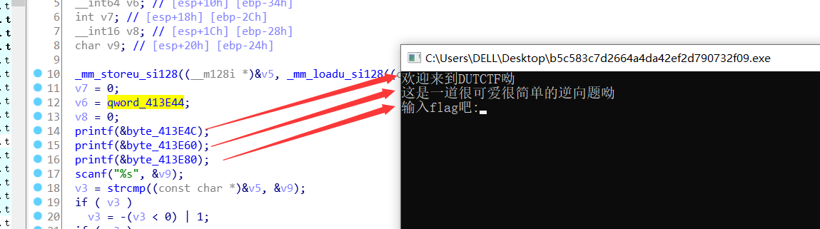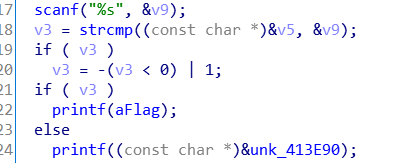 然后这有个if判断语句,if后面的那个printf打印的是废话,那else后面应该就是flag内容,这是我猜测的。(但是并不是,他只是成功了之后提示flag get的字符串) 。