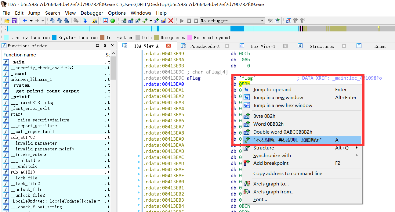 右键十六进制,直接就可查看连续内存地址存储的内容。就比如下面这一连串十六进制数字,看着好像flag,谁知道并不是。