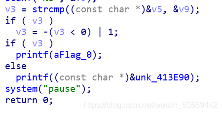 输入一个字符串给v9,v9和v5进行比较,如果他们相等则为v3等于0;