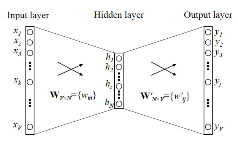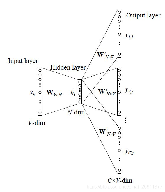 隐含层输出一个 N 维向量 x, 每个 x 被一个 N 维权重 w 连接到输出节点上,有 V 个这样的输出节点,就有 V 个权重 w,再套用 softmax 的公式,变成 V 分类问题。这里的类别就是词表里的 V 个词,所以一个词就对应了一个权重 w,从而可以用 w 作为该词的词向量,即文中的输出词向量。