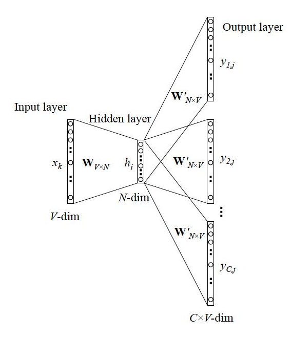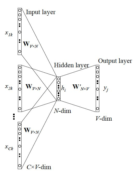 跟 Skip-gram 的模型并联不同,这里是输入变成了多个单词,所以要对输入进行处理(一般是求和然后平均),输出的 cost function 不变。