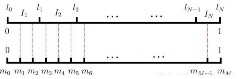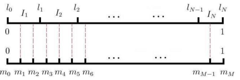 2. 负例采样(Negative Sampling):这种优化方式做的事情是,在正确单词以外的负样本中进行采样,最终目的是为了减少负样本的数量,达到减少计算量效果。将词典中的每一个词对应一条线段,所有词组成了[0,1]间的剖分,如下图所示,然后每次随机生成一个[1, M-1]间的整数,看落在哪个词对应的剖分上就选择哪个词,最后会得到一个负样本集合。
