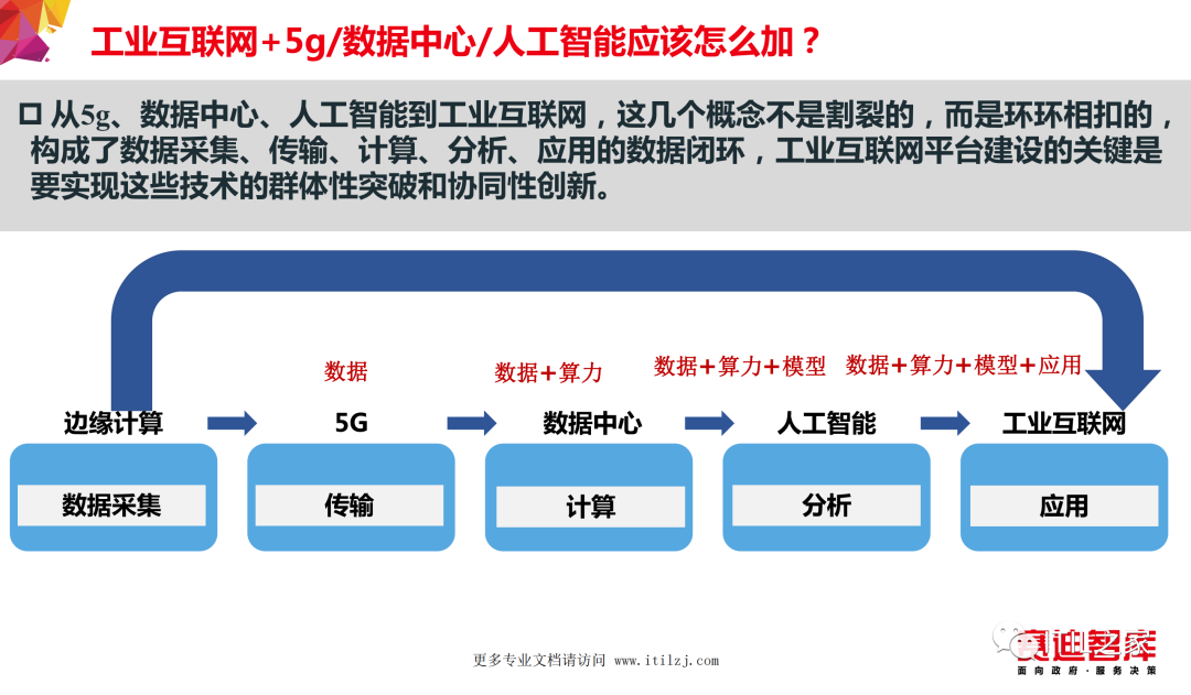 从技术视角看,工业互联网是新基建的牛鼻子,从5G、数据中心、人工智能到工业互联网,这几个概念不是割裂的,而是环环相扣的,构成了数据采集、传输、计算、分析、应用的数据闭环,工业互联网平台建设的关键是要实现这些技术的群体性突破和协同性创新。