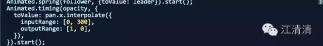 interpolation还支持任意形式的渐变方法,很多类型已经Easing类中定义了,例如:二次函数,指数函数,贝塞尔曲线等step以及bounce。interpolation还可以设置区间outputRnage的输出值边界。可以设置extrapolate,extrapolateLeft或者extraplateRight可选属性。默认值为extend(允许超出),但是我们可以设置clamp属性来避免值超出outputRange的最大边界值。