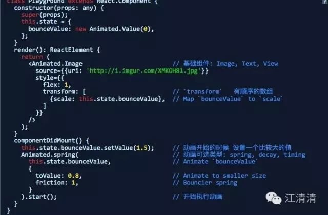 上面代码,其实bounceValue作为state的一部分在构造函数中进行初始化,然后复制给图片的缩放比例。在动画不断执行的时候,该数值会发生改变然后重新设置缩放大小。当组件被挂载的时候,该缩放值设置到1.5,然后在bounceValue值基础上面运行弹跳动画(spring),在动画运行过程中会重新刷新缩放值,同时图片的大小缩放比例也会发生变化了。这种方法比起调用setState方法并且重新刷新组件效率来的高。因为这一切配置都是直接声明配置的,当然我们还可以进一步进行优化动画效果。例如可以配置顺序执行的动画,然后整体动画效果会跟着我们的配置进行相应的执行。