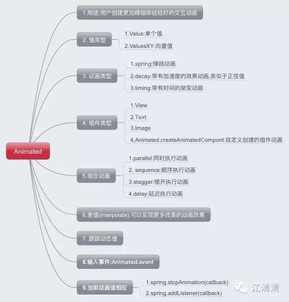 上面是Animated库的相关知识点,接下来我们会一块块的进行详细讲解分析,同时在本专题第二篇会用大量的实例进行演示使用