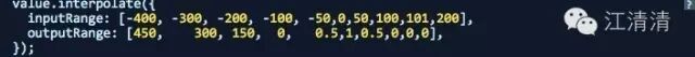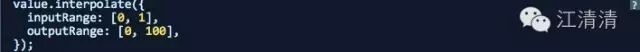 Animated库API还提供一个非常强大的功能是interpolate插值动画效果。该允许一个输入的区间范围映射到另外一个输入的区间范围。例如:一个简单的实例0-1的区间映射到0-100的区间范围: