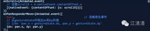 Animated.event在Animated API中和手势输入模块相关。该允许手势事件以及其他事件操作。该通过一个结构化得数组进行拆分显示复杂的事件对象。该方法参数是一个数组可以映射输入多个事件的对象。我们来看下面的一个例子:我们把event.nativeEvent.contentOffset.x的值赋值到scrollX变量中(event一般为回调方法的第一个参数)。同时取出手势状态的gestureState.dx和gestureState.dy的值赋值到pan.x何pan.y变量中(gestureState通常为PanResponder回调方法中的第二个参数)。来我们看代码示例: