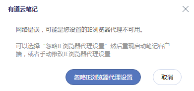 发现打开有道云报以下错误,如果点忽略IE浏览器代理设置,则可以正常同步笔记,如果点击取消,则不能同步笔记。
