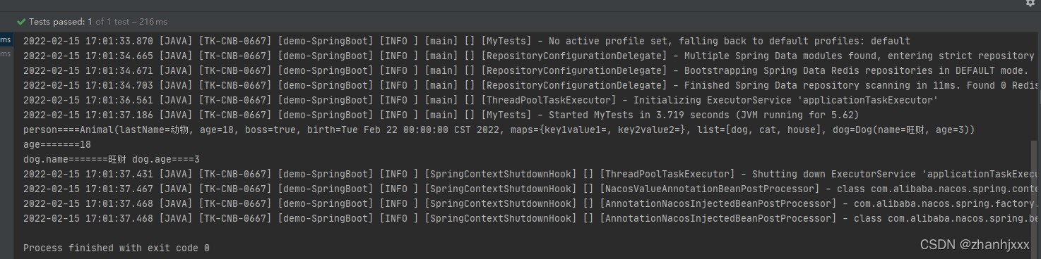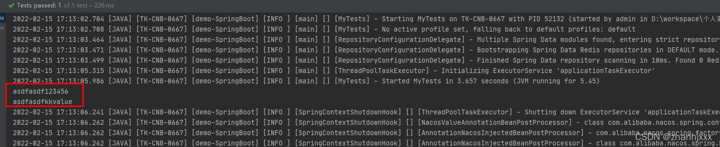 public class MyTests {@AutowiredRemoteProperties remoteProperties;@Testpublic void test2() {TestCase.assertEquals(1, 1);String testpass=remoteProperties.getTestpass();System.out.println("-----------:"+testpass);System.out.println("------------:"+remoteProperties.getTestvalue());}