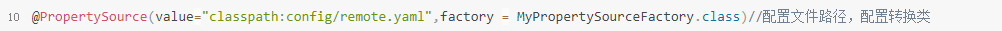 @PropertySource(value="classpath:config/remote.yaml",factory = MyPropertySourceFactory.class)//配置文件路径,配置转换类
