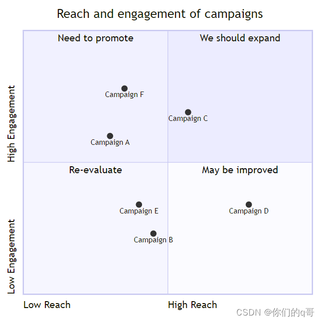 象限图是分为四个象限的数据的直观表示。 它用于在二维网格上绘制数据点,其中一个变量表示在 x 轴上,另一个变量表示在 y 轴上。 象限是通过根据一组特定于所分析数据的标准将图表分为四个相等部分来确定的。 象限图通常用于识别数据的模式和趋势,并根据图表中数据点的位置确定操作的优先级。 它们通常用于商业、营销和风险管理等领域。