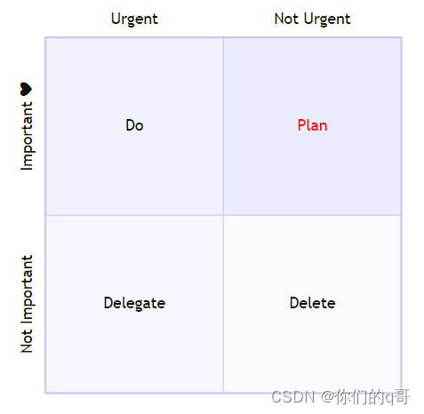 quadrantChartx-axis Urgent --> Not Urgenty-axis Not Important --> "Important ❤"quadrant-1 Planquadrant-2 Doquadrant-3 Delegatequadrant-4 Delete
