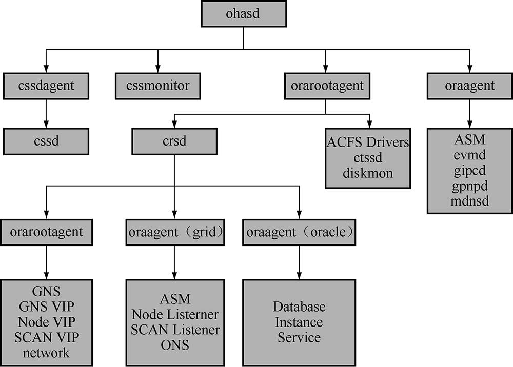 以grid用户权限启动,负责mdnsd进程、gipcd进程、gpnpd进程、evmd进程、asm进程(11gR2之后的asm在集群中被放置到了更底层,和之前版本区别较大)。