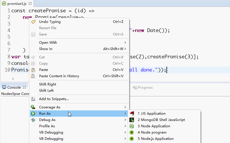 这里需要注意的是,我们的createPromise函数,不再返回的是Promise对象,而是一个函数,函数里面再返回Promise对象。运行我们的代码,截图如下: