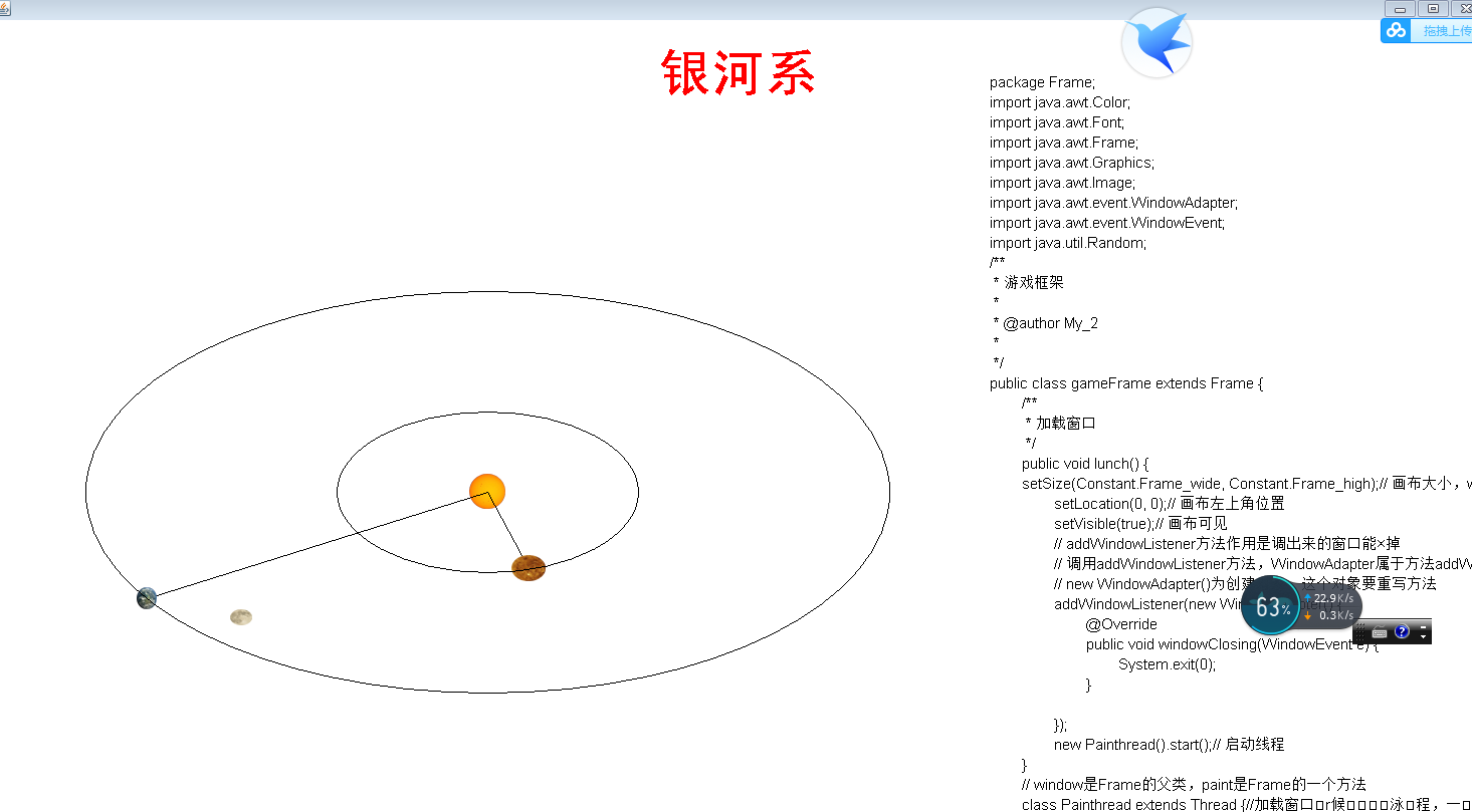 solarFengzhuang继承自窗口加载类,lunch是父类加载窗口方法,且父类中还有paint方法,paint方法在此子类中被重写,lunch一旦加载就会显示出窗口,之后会启动线程,线程工作是个循环过程,每隔40毫秒循环一次,每次循环会在窗口调用paint方法,在这个项目中,每个循环会画一次太阳、地球、行星、月亮,而这个画的操作我们把它封装到一个类中,先把太阳封装起来,封装的类有需要加载的太阳图片、位置、以及画的方法,类搞好之后我们创建一个太阳对象,创建时候对其初始化,就是把参数传进去然后由对象调用画的方法,对于地球、行星、月亮由于其位置还与围绕的星位置有关故类应该与太阳不同,继承即可