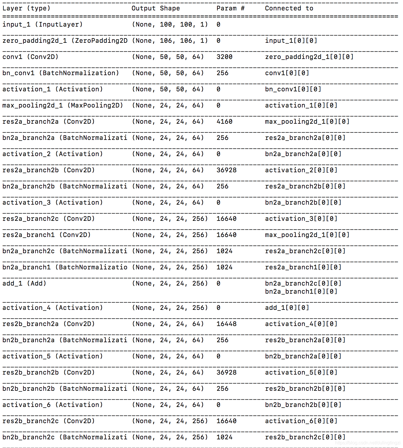 然后我把自己的densenet和resnent的模型打印出来,model.summery()得到了两个模型的结构,下面是densenet的(没截全,只取了一开始和结尾部分):