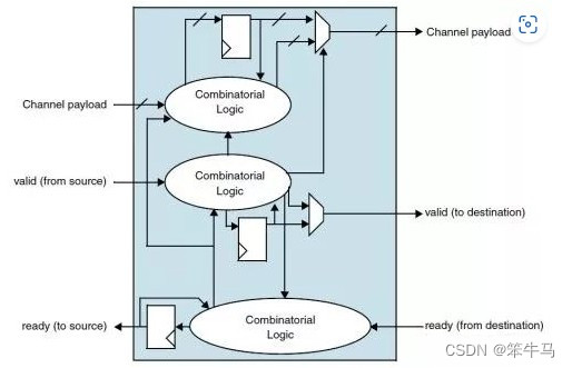 (1)这种模式下,forward control path/payload没有刻意插入registers,而backward control path/payload(尤其指ready from destination这条路上),被插入了registers。