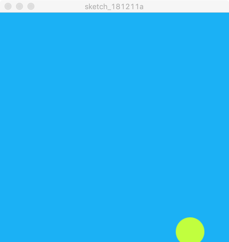 void draw() {background(#1BB1F5); ellipse(radiuPosX, radiuPosY, radiu, radiu); if (isXSub) {radiuPosX += moveX;} else {radiuPosX -= moveX;}if (radiuPosX > width) {radiuPosX = width;isXSub = false;}if (radiuPosX < 0) {radiuPosX = 0;isXSub= true;}if (isYSub) {radiuPosY += moveY;} else {radiuPosY -= moveY;}if (radiuPosY > height) {radiuPosY = height;isYSub = false;}if (radiuPosY < 0) {radiuPosY =0;isYSub= true;}