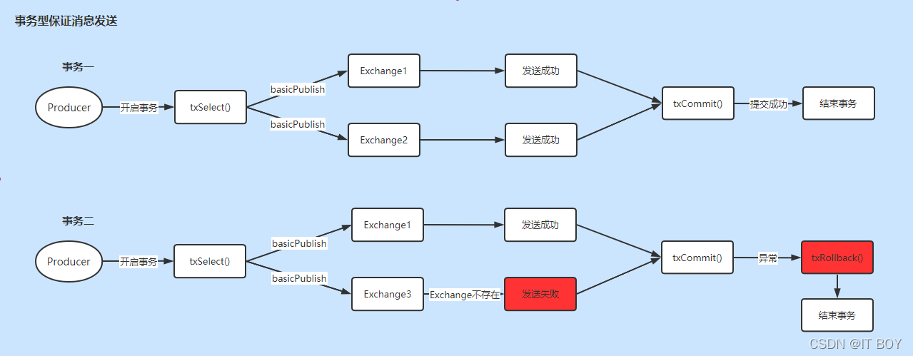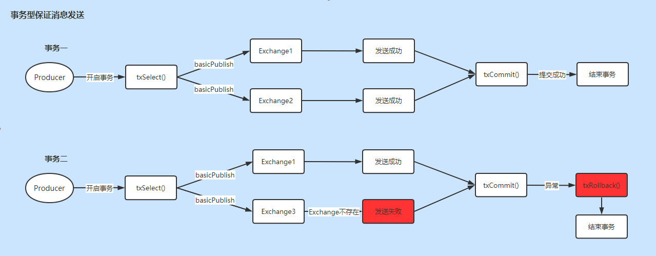 public class TransactionProducer {public static void main(String[] args) {// 创建消息信道Connection connection = RabbitMQUtils.getConnection();Channel channel = RabbitMQUtils.createChannel(connection);// 这是第一个成功事务try {// 使用事务的方式发送消息channel.txSelect();// 发送一个消息到Exchange:TRANSACTION_1_EXCHANGE,路由键:transactionchannel.basicPublish("TRANSACTION_1_EXCHANGE", "transaction", MessageProperties.PERSISTENT_TEXT_PLAIN,"这是事务型消息1".getBytes());// 发送一个消息到Exchange:TRANSACTION_2_EXCHANGE,路由键:transactionchannel.basicPublish("TRANSACTION_2_EXCHANGE", "transaction", MessageProperties.PERSISTENT_TEXT_PLAIN,"这是事务型消息2".getBytes());channel.txCommit();System.out.println("消息1和2发送成功");} catch (Exception ex) {try {// 回滚消息的发送System.out.println("消息1和2被回滚了");channel.txRollback();} catch (IOException e) {e.printStackTrace();}}// 这是第二个失败事务:因为Exchange3不存在。try {// 使用事务的方式发送消息channel.txSelect();// 发送一个消息到Exchange:TRANSACTION_1_EXCHANGE,路由键:transactionchannel.basicPublish("TRANSACTION_1_EXCHANGE", "transaction", MessageProperties.PERSISTENT_TEXT_PLAIN,"这是事务型消息3".getBytes());// 发送一个消息到Exchange:TRANSACTION_3_EXCHANGE,路由键:transactionchannel.basicPublish("TRANSACTION_3_EXCHANGE", "transaction", MessageProperties.PERSISTENT_TEXT_PLAIN,"这是事务型消息4".getBytes());channel.txCommit();System.out.println("消息3和4发送成功");} catch (Exception ex) {try {// 回滚消息的发送System.out.println("消息3和4被回滚了");channel.txRollback();} catch (IOException e) {e.printStackTrace();}}}}