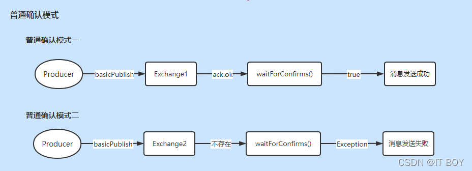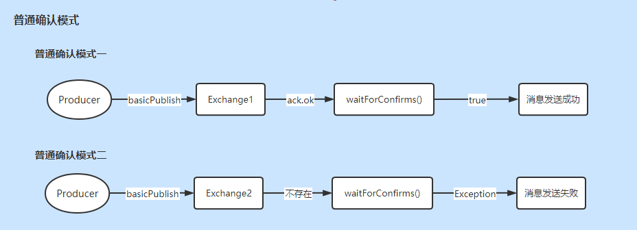 普通确认模式比较简单,发送一条消息后,等待Broker确认,如果服务端返回false或者超时时间内未返回,生产者则可以认为消息发送失败。如果网络错误会抛出连接异常,如果目标Exchange不存在则会抛出404错误。