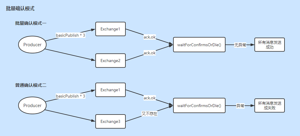 批量确认模式:每发送一批消息后,调用waitForConfirmsOrDie()方法,等待Broker确认。只要有一个未被Broker确认就会抛出IoException。