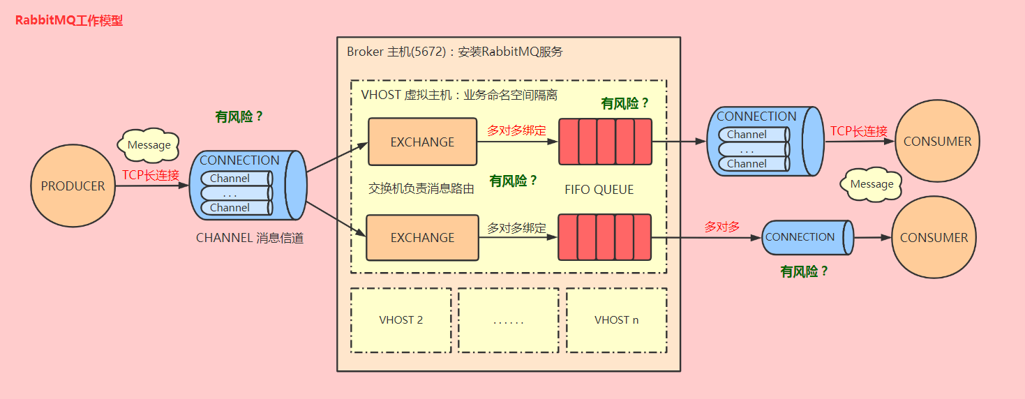 先来看看RabbitMQ的工作模型中,可能存在哪些风险点: