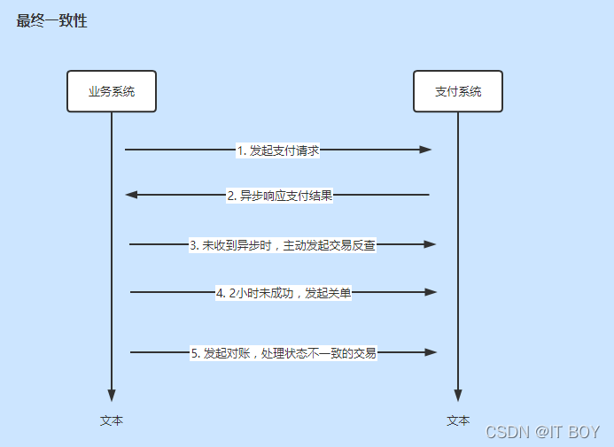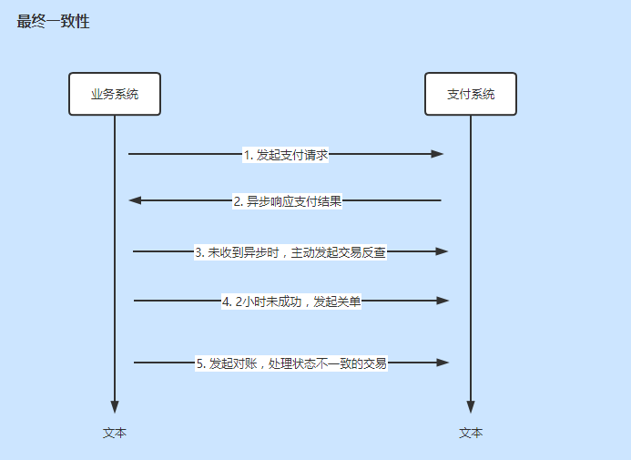 举例来说,在支付系统中,使用MQ作为异步支付结果的通知,除此之外,会增加一定的反查机制和对账机制,业务系统发起支付后,等待支付系统的异步结果,如果2分钟(根据实际情况来定,可能是多次阶梯型)没有收到支付结果,业务系统就主动发起交易状态反查。如果2小时后还没有支付结果,业务系统就会发起关单,认为此笔交易失败。同时第二天,业务系统会发起和支付系统的对账操作,防止交易系统后续又处理成功的场景。使用多种方式来防止交易状态不一致的情况。