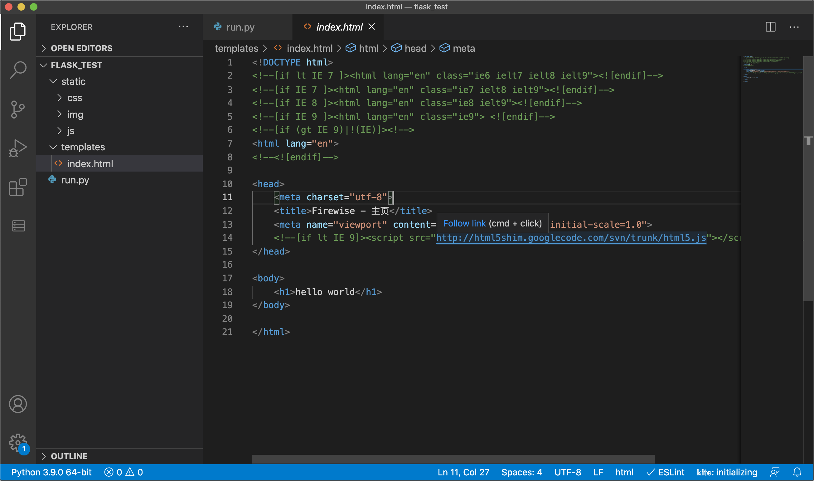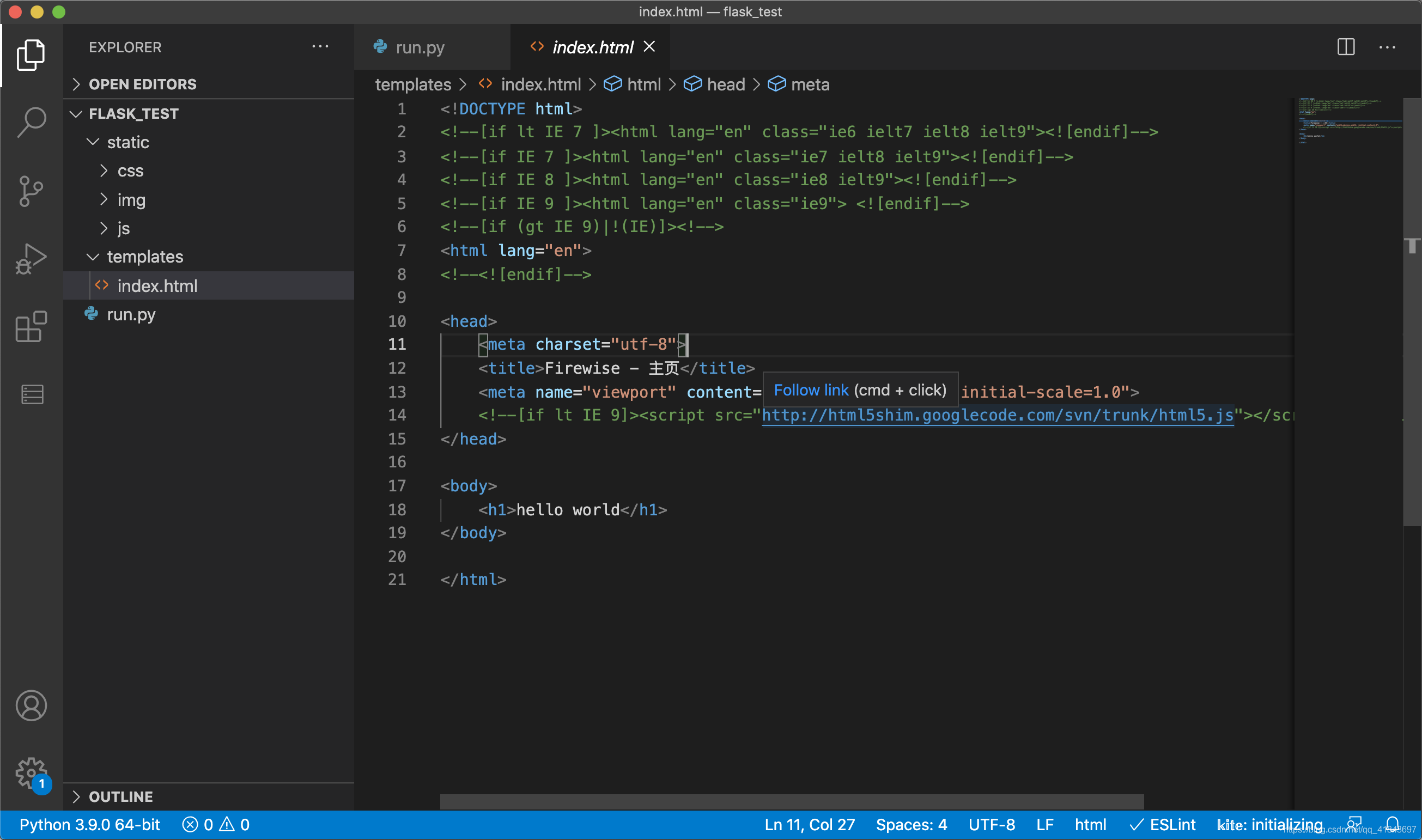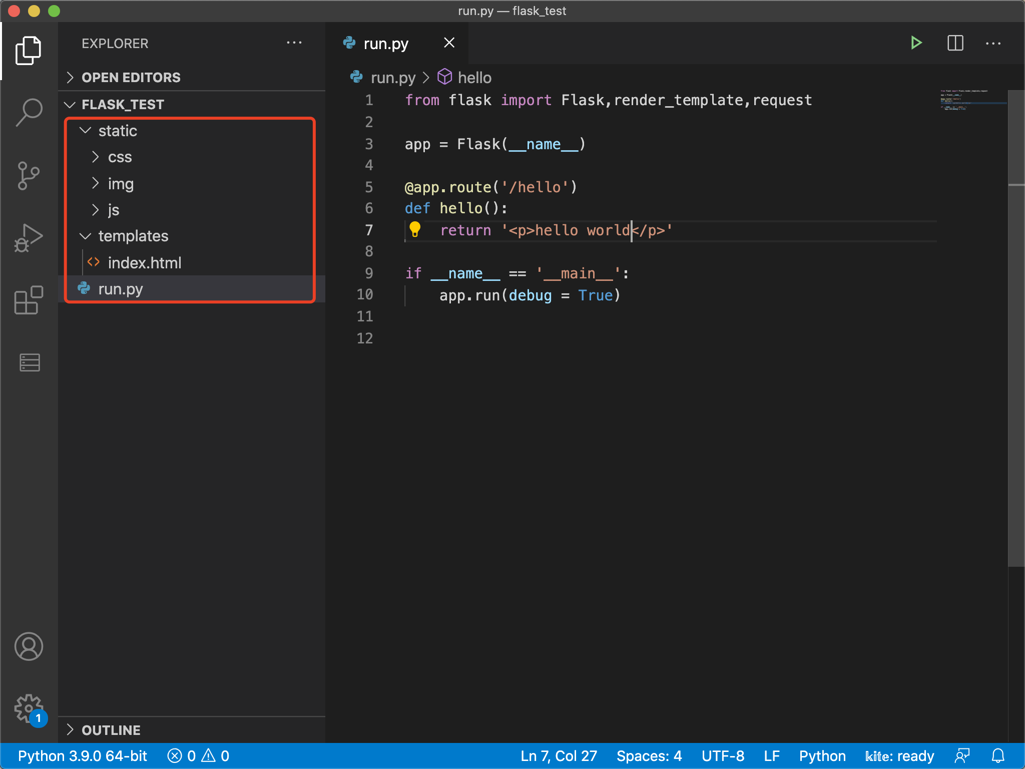 而如果需要返回一个网页的话,可以在templates中创建需要的html网页,再在run.py文件对应的方法中进行返回,返回格式为:
