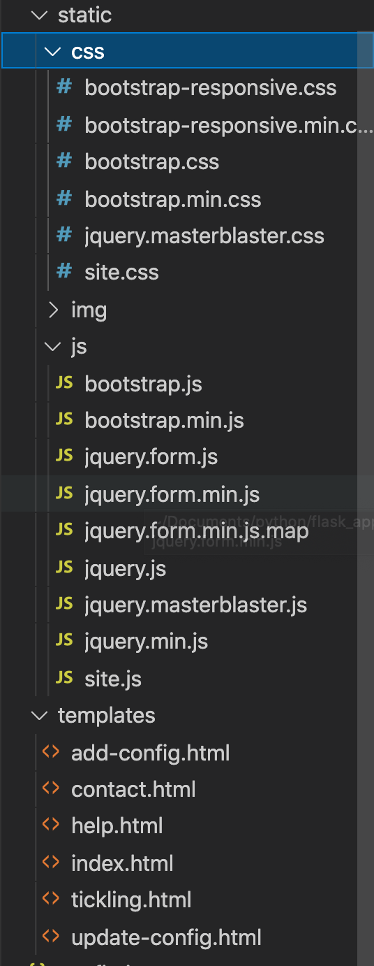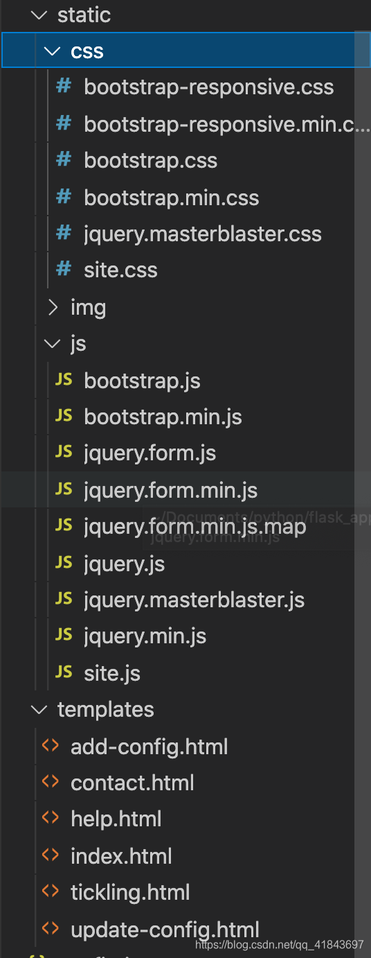 项目结构如上图所示,其中static用来放置静态文件,如js文件、css文件以及图片等,templates文件夹用来放置模板文件,即html文件。