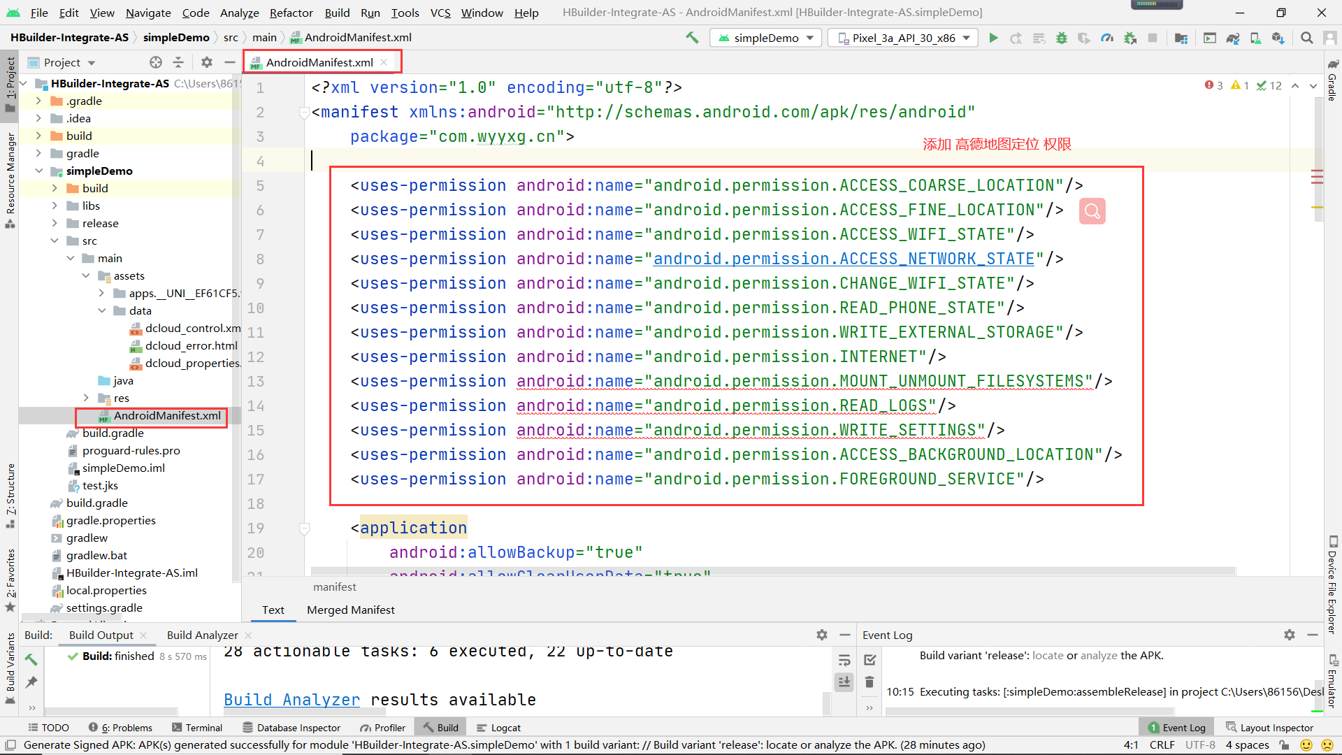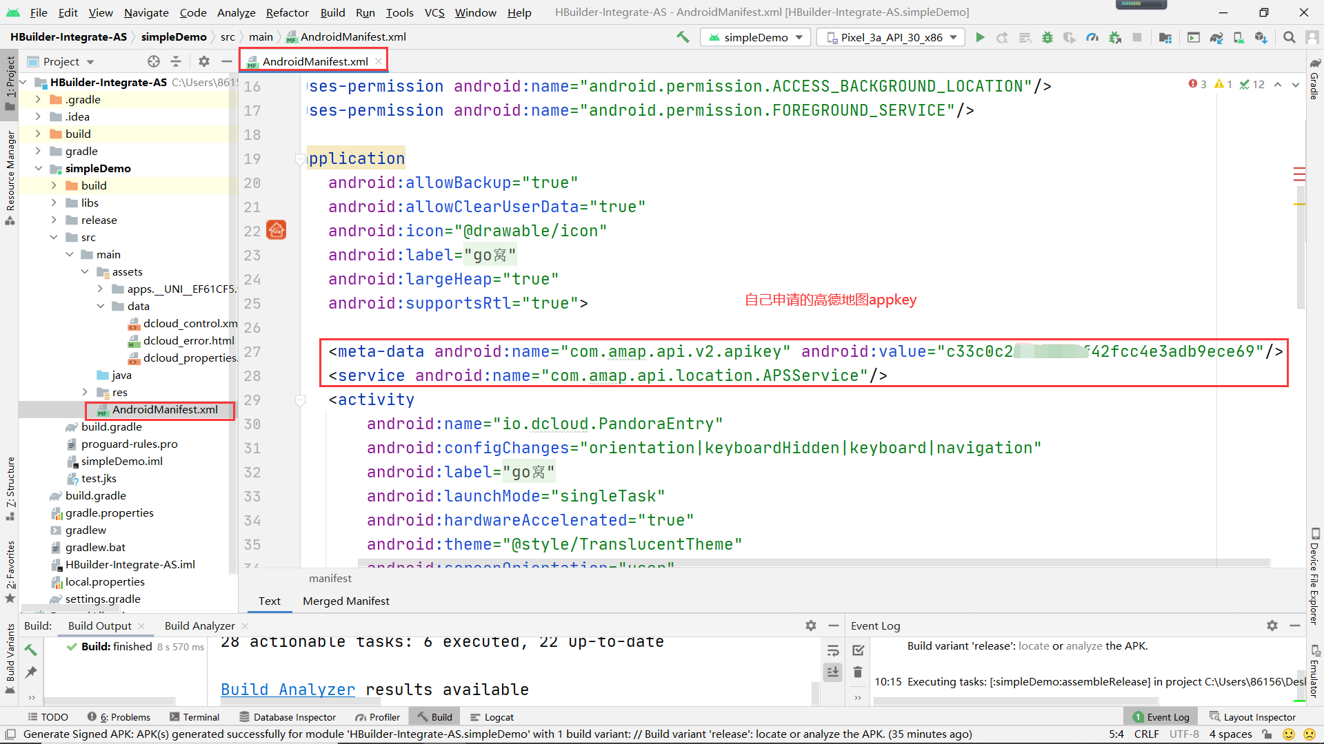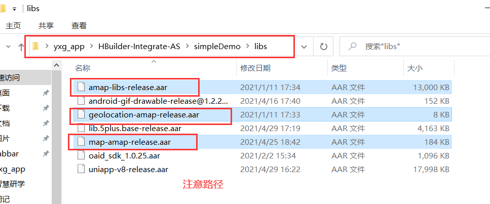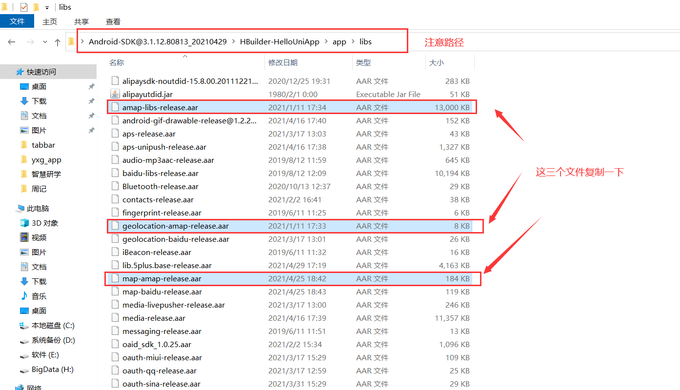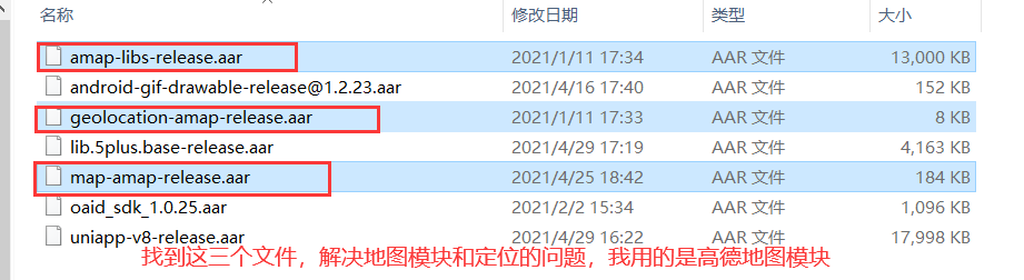 出现上面两张图的,是因为地图模块没有添加!需要找到一开始 解压到桌面的SDK 文件夹 Android-SDK,找到需要的文件复制进去,比如我的地图模块,离线打包官方高德地图定位文档