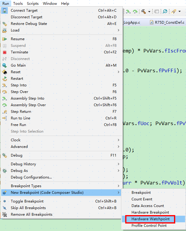 可能是CCS的帮助文档比较老版的原因,实际操作是这样的:先烧录程序进入debug模式,然后,选择run>new Breakpoint>hardware watchpoint: