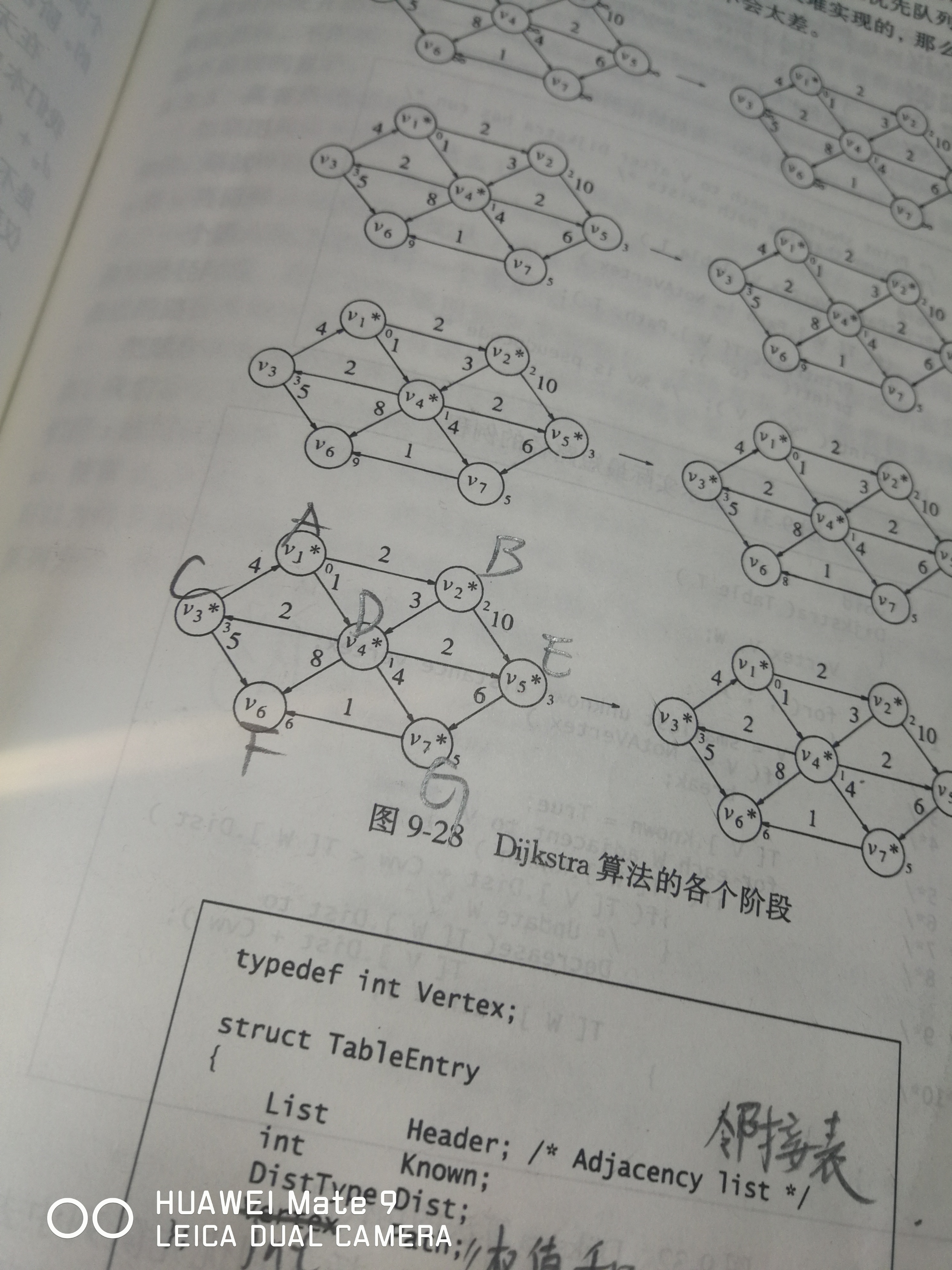 {int m, n;edgeNode *e = NULL;edgeNode *q = NULL;cout << "依次输入顶点数与边数:" << endl;cin >> n >> m;v = n;w = m;cout << "录入邻接表信息:" << endl;cout << "录入所有顶点的英文编号:" << endl;for(int i = 0; i < n; i++){cin >> adjList[i].data;adjList[i].first = NULL;}cout << "录入邻接表信息,以‘起始顶点 被指向顶点 边权值’为格式:" << endl;char a, b;int cost;for (int j = 0; j < w; j++){cin >> a >> b >> cost;int vertexA = locatex(a);//起始节点的编号int vertexB = locatex(b);//被指向节点的编号e = new edgeNode;e->adjvex = vertexB;e->next = NULL;//头插法链表if (adjList[vertexA].first == NULL)q = adjList[vertexA].first = e;/*单链表标志性的连等写法。根据右结合,等同于adjList[vertexA].first=e;q=adjList[vertexA].frist;*/elseq = q->next = e;}