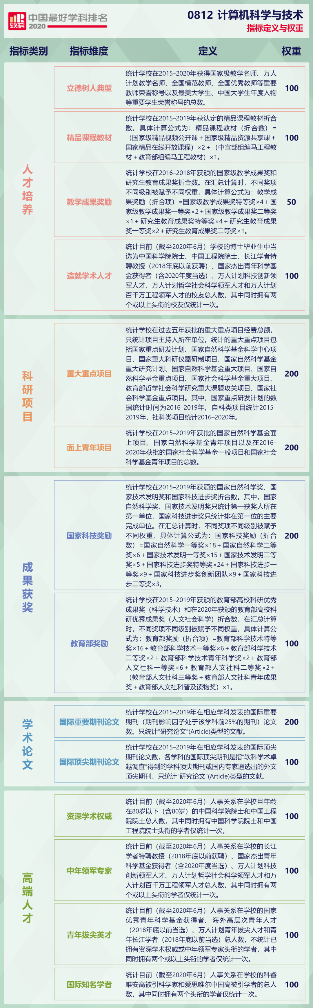 中国最好学科排名的指标体系由人才培养、科研项目、成果获奖、学术论文、高端人才5个指标类别组成,下设16个指标维度,包括50余项测量指标。由于部分指标在不同学科门类的适用性和重要性存在差别,因此中国最好学科排名在不同学科采用差异化的指标体系。计算机科学与技术学科的指标定义与权重如下: