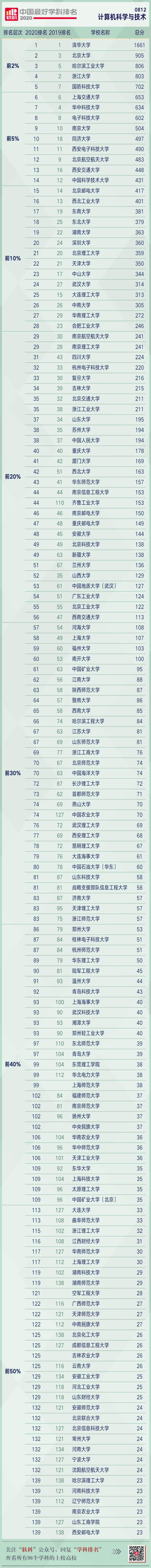 高等教育评价专业机构软科正式发布“2020软科中国最好学科排名”,排名榜单包括96个一级学科。计算机科学与技术学科排名共有144所大学上榜,清华大学、北京大学、哈尔滨工业大学、浙江大学、国防科技大学位列前2%。完整排名名单如下: