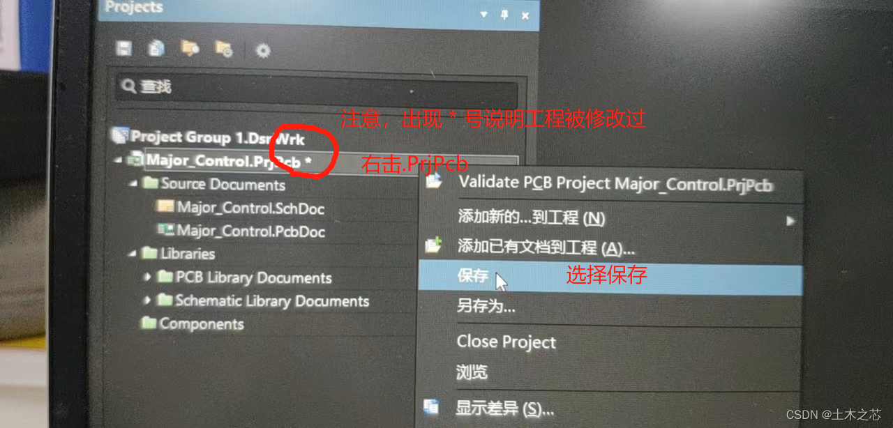 接着是新建一个工程,一个工程一般具有包括四要素:原理图 、原理图库、PCB、PCB元件库(注意,这些都是在新建的项目工程下添加的,而不是直接添加四个这样的就 组成了一个工程 ,这样子这四个之间是没有 相互关联的,这个错误希望各位萌新不要犯,切记切记切记!!!)这四个子文件的后缀分别是:.SchDoc、.SchLib、.PcbDoc、.PcbLib,每创建一个就保存一个 ,然后在左边栏工程那里,右击工程,选择保存,这样子这四个子文件就会保存在同一个工程下面,并且是有机关联的。